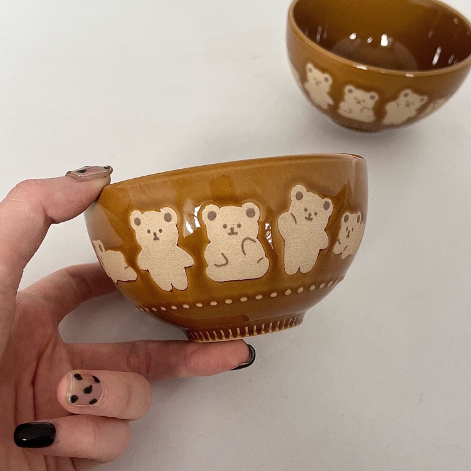 This ceramic bowl features an embossed bear motif with a soft matte finish on the surface. It uses underglaze coloring for a smooth texture and gentle look, making it suitable for rice, snacks, or small side dishes.