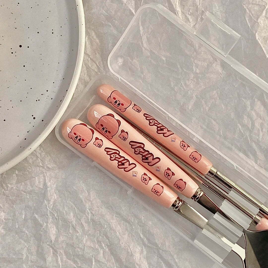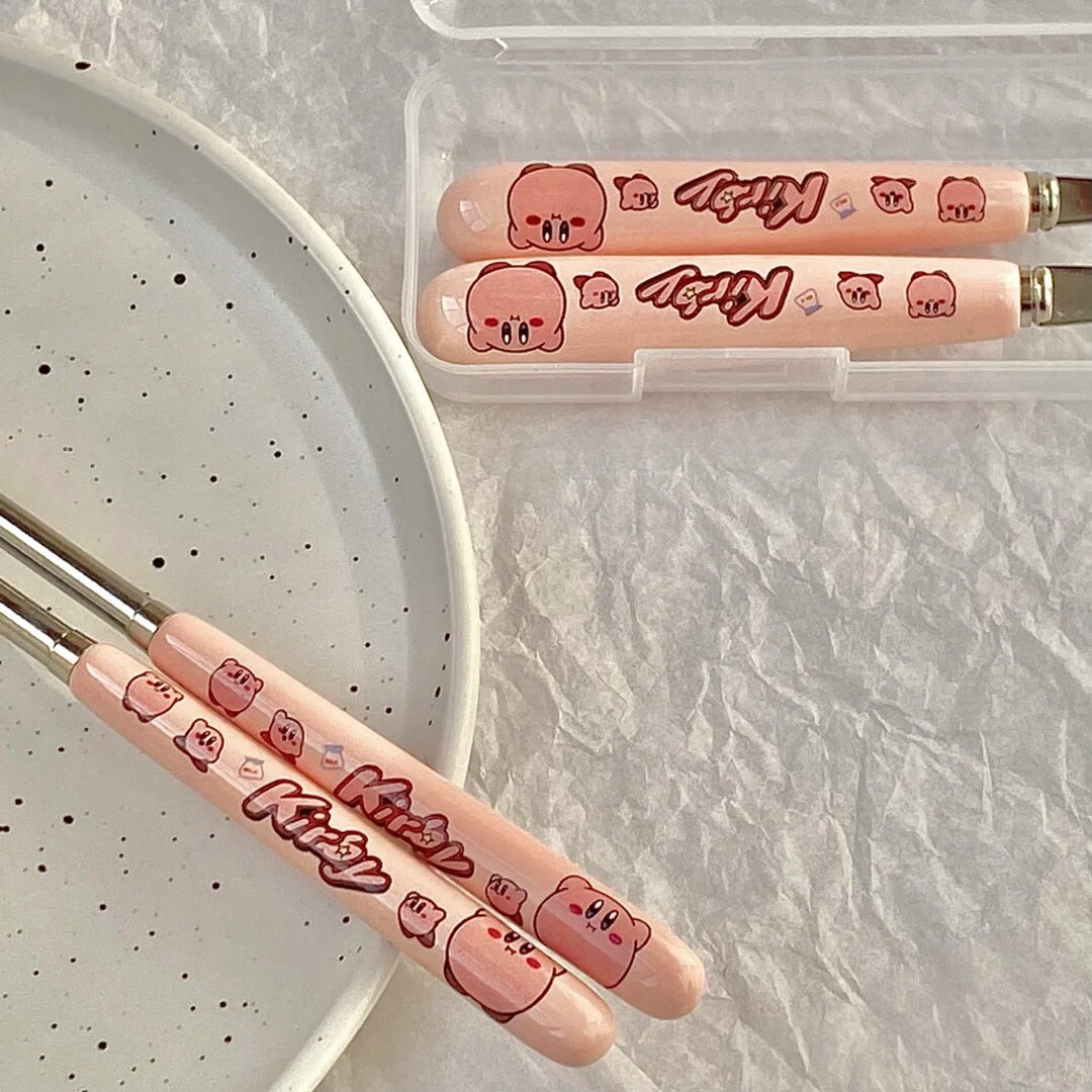 This 4-piece Kirby ceramic tableware set includes a spoon, fork, chopsticks, and storage case. Made from stainless steel and ceramic, the utensils are sturdy, smooth, and easy to clean. The spoon measures 1.6 in wide and 6.5 in long, while the fork measures 1.0 in wide and 7.1 in long.