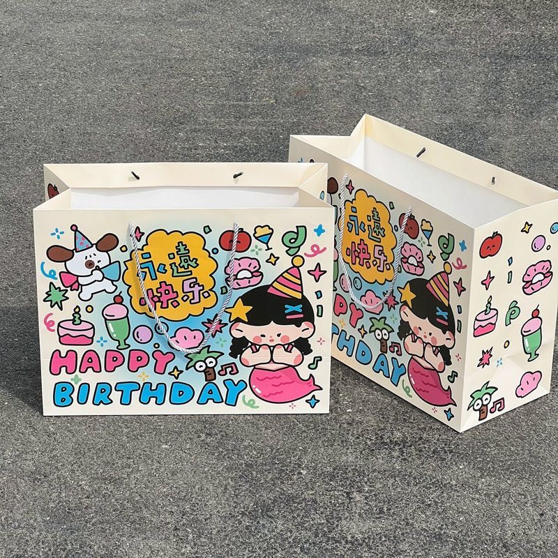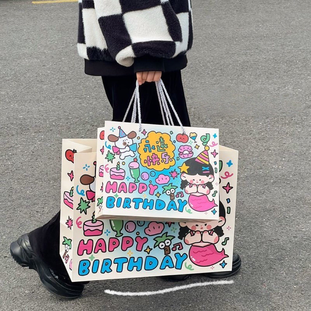 This mermaid-themed gift bag is made from thick white card paper for a sturdy, premium feel — perfect for presenting birthday gifts or party favors. Available in two sizes to suit different needs.